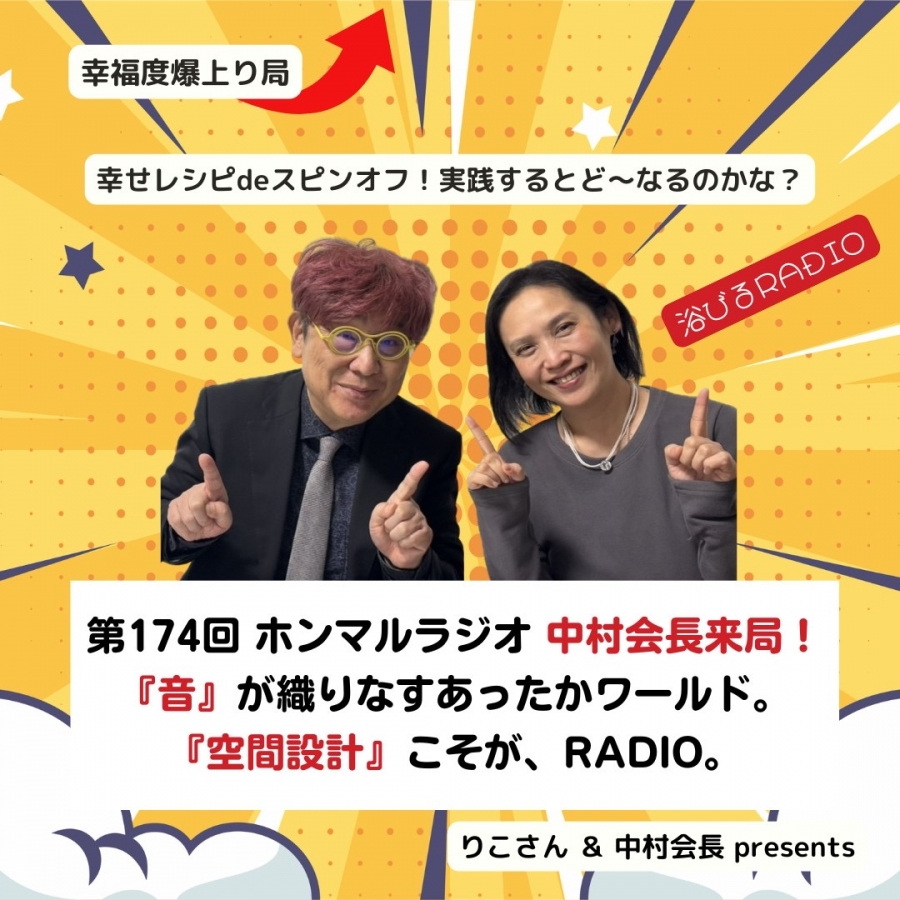 - 【第174回】幸せレシピdeスピンオフ! 実践するとど~なるのかな? ~ホンマルラジオ 中村会長来局!『音』が織りなすあったかワールド。『空間設計』こそが、RADIO。 ~ ♯スピリチュアル