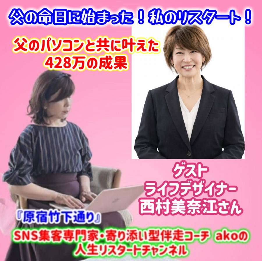 - 【田邉晶子】『原宿竹下通り』 SNS集客専門家・寄り添い型伴走コーチ akoの人生リスタートチャンネル 【第3回ゲスト】ライフデザイナー 西村美奈江さん(#政治経済)