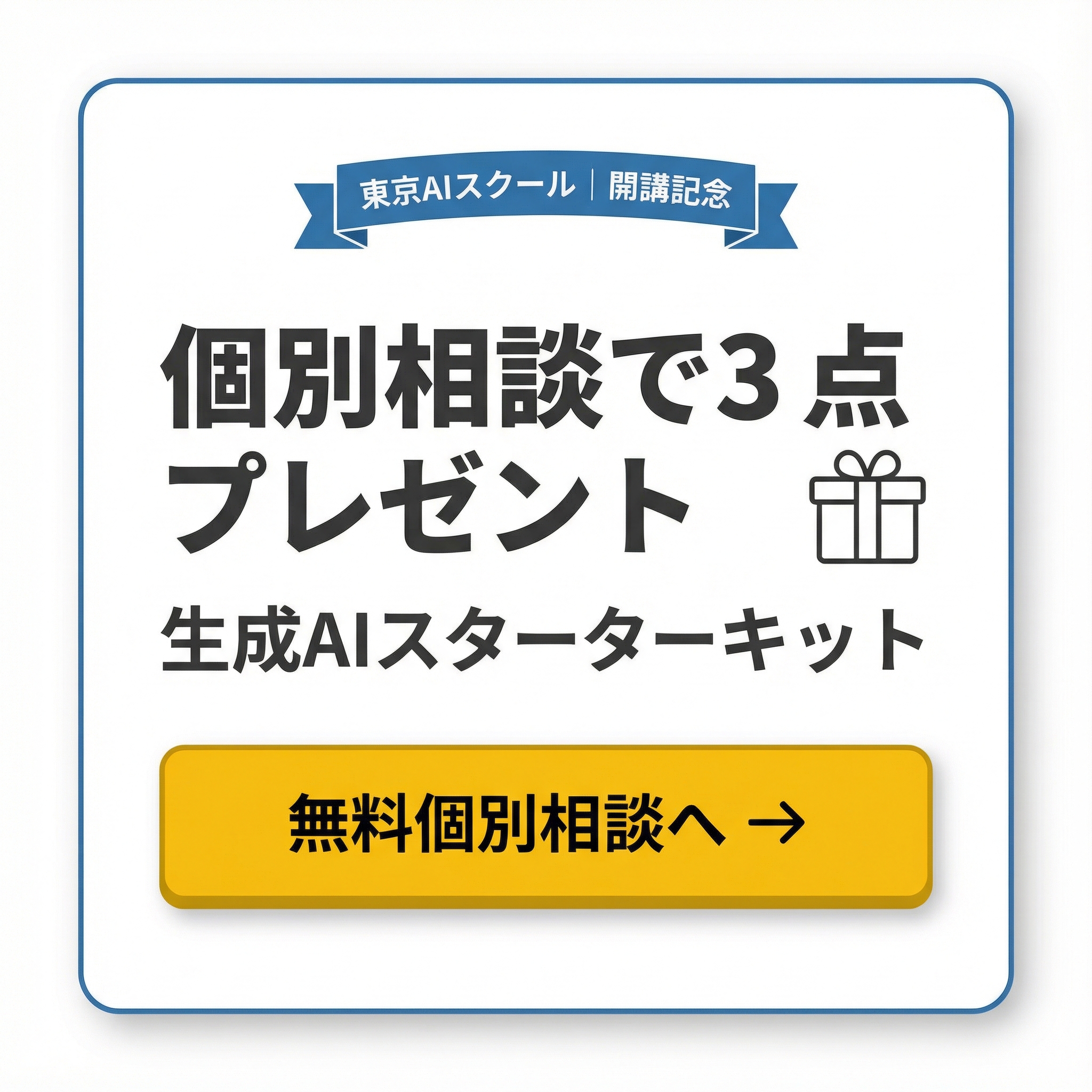 個別相談特典!「生成AIスターターキット」3点をプレゼント。個別相談にご参加いただいた方に、生成AI×クリエイティブ基礎マニュアル・【即使える】用途別プロンプト50選・向いているスキル診断マップの3点を特別プレゼントいたします。