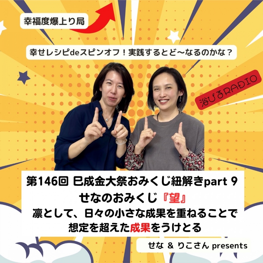 - 【第146回】幸せレシピdeスピンオフ! 実践するとど~なるのかな? ~巳成金大祭おみくじ紐解きPart9せなのおみくじ『望』小さな成果を重ねることで想定を超えた成果をうけとる~ ♯スピリチュアル