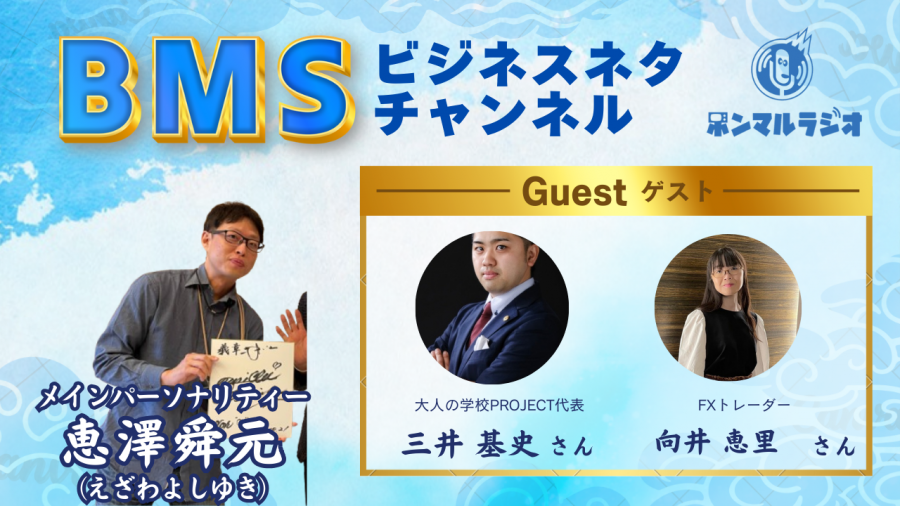 「BMS×ビジネス×○○」のテーマでいろんなコンテンツを持っているゲストをお呼びして放送10分で表層部分のお話をさせていただきます。