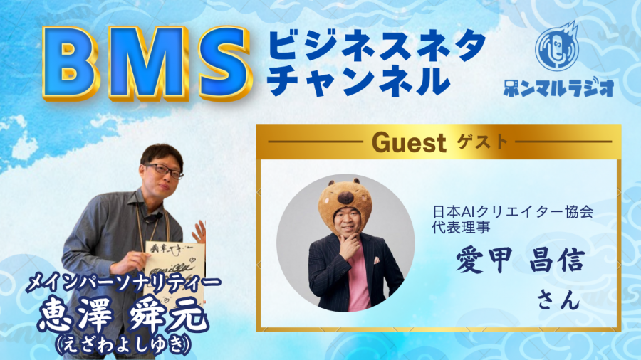- BMSビジネスネタチャンネル【1156回目】日本AIクリエイター協会代表理事の愛甲昌信さんが業界の舞台裏何で日本AIクリエイター協会をはじめようと思ったのかについて語ります#福祉介護・生活