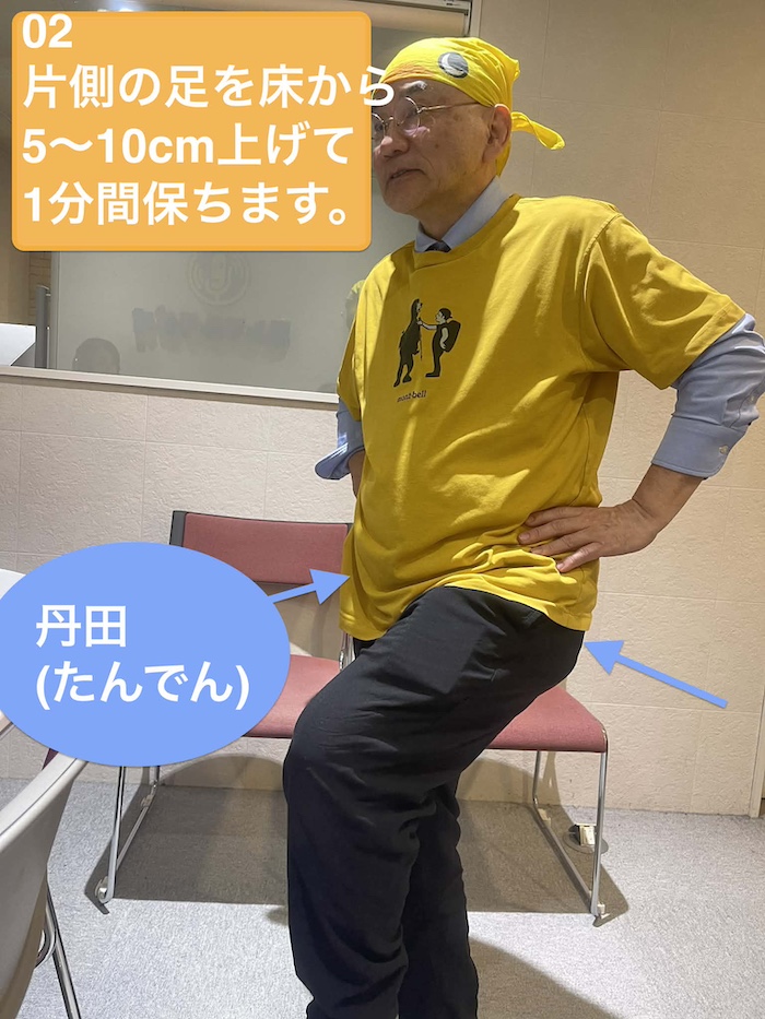 片側の足を床から5~10cm上げて1分間保ちます。