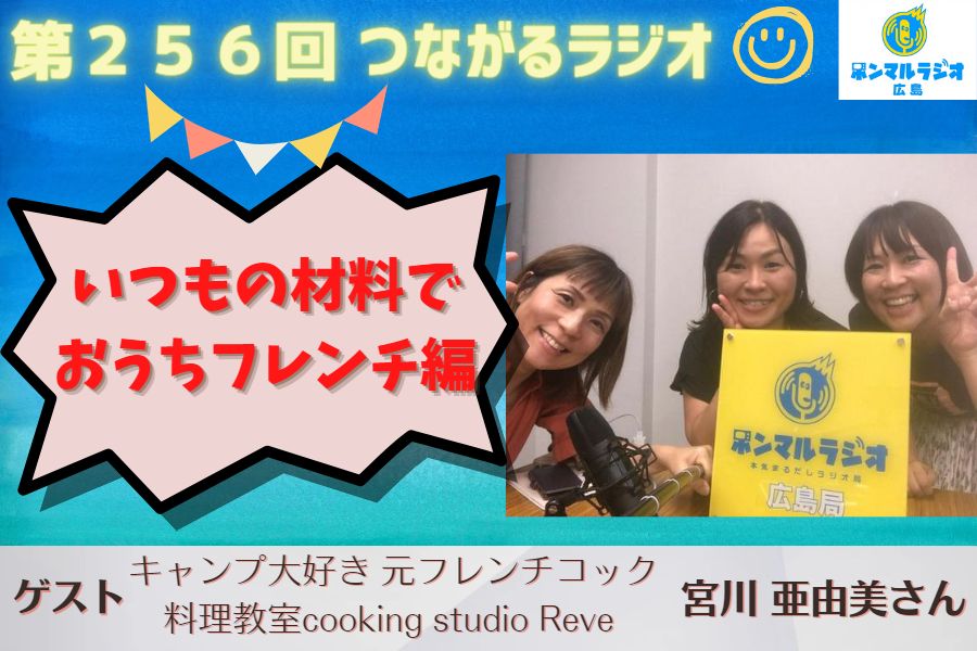 2023/07/14【広島】【256回】つながるラジオ いつもの材料でおうちフレンチ編 ゲスト:キャンプ大好き 元フレンチコック 料理教室cooking studio Reve 宮川 亜由美さん #エンタメ