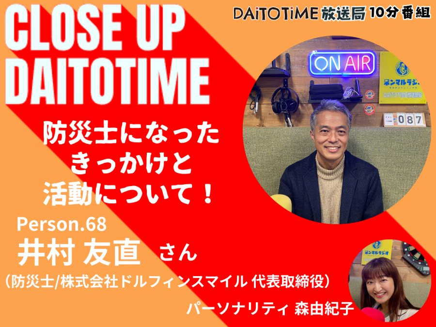 - DAITOTIME放送局『クローズアップDAITOTIME』井村 友直さん 防災士・株式会社ドルフィンスマイル 代表取締役① #福祉介護・生活