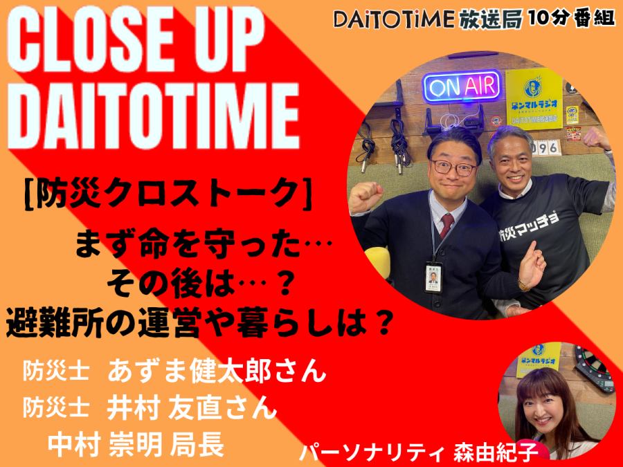 - DAITOTIME放送局『クローズアップDAITOTIME』防災クロストーク②防災士・あずま 健太郎さん&井村 友直さんと中村局長 #福祉介護・生活