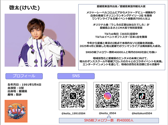 | ゲスト名 | 愛媛県 東温市 観光大使 啓太さん |