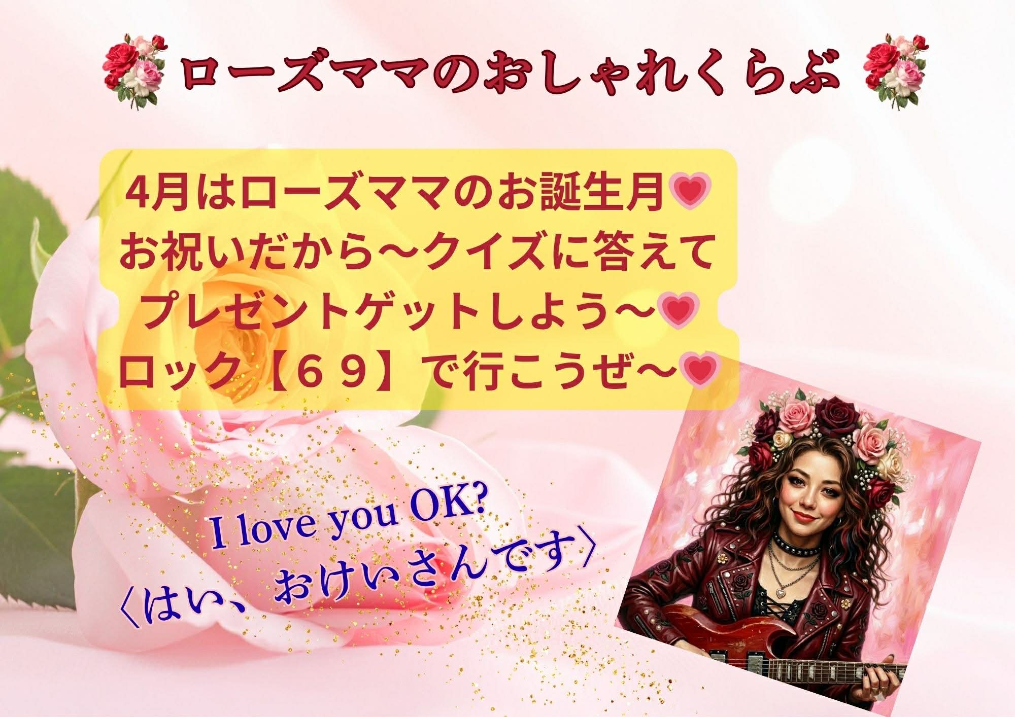 - 【富澤恵以小】ローズママのおしゃれくらぶ♡ 【第5話】4月はローズママのお誕生月♡ お祝いだから、クイズに答えてプレゼントゲットしてね!ロック(69)で行こうぜ〜!(#美容健康)